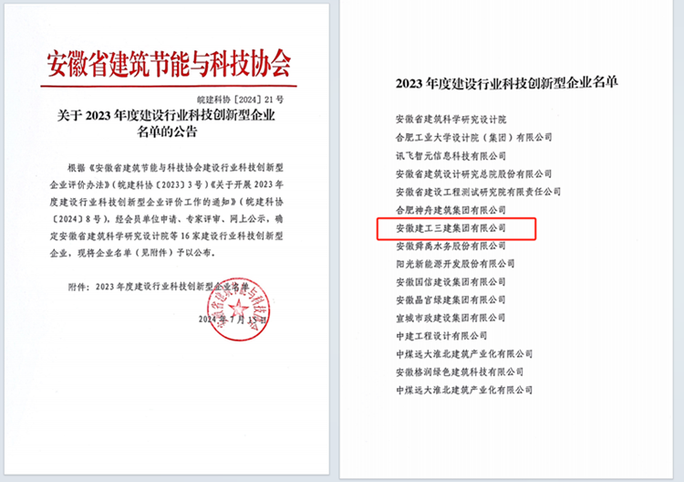 近日,安徽省建筑節(jié)能與科技協(xié)會(huì)公布“2023年度建設(shè)行業(yè)科技創(chuàng)新型企業(yè)”名單,安徽建工三建集團(tuán)作為唯一一家省屬國有施工企業(yè)榮登榜單。