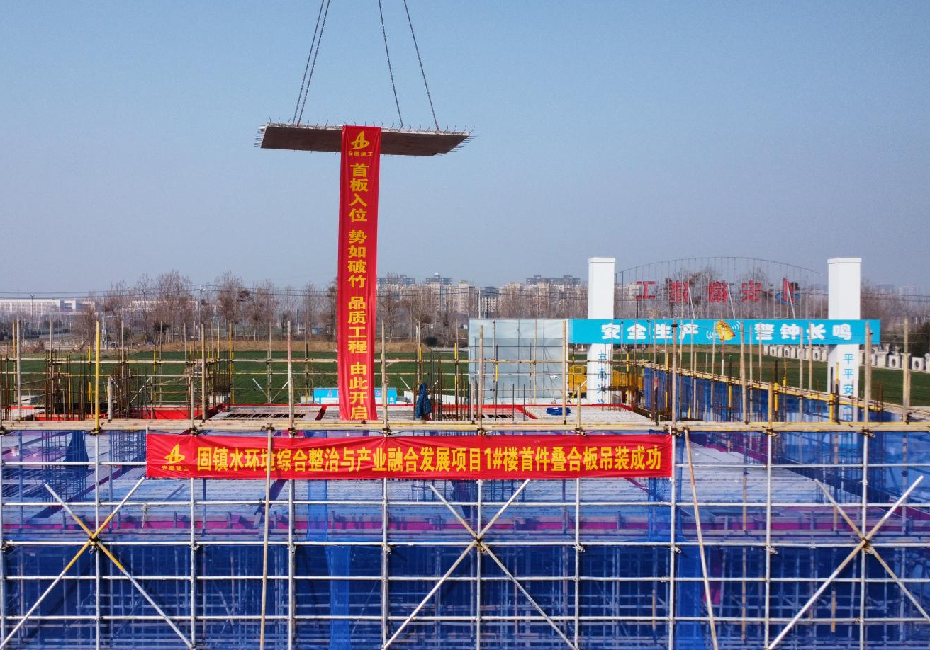 近日,固鎮水環境綜合整治與產業融合發展項目首件疊合板精準就位、吊裝成功,項目建設正式邁入主體結構裝配式施工關鍵階段。