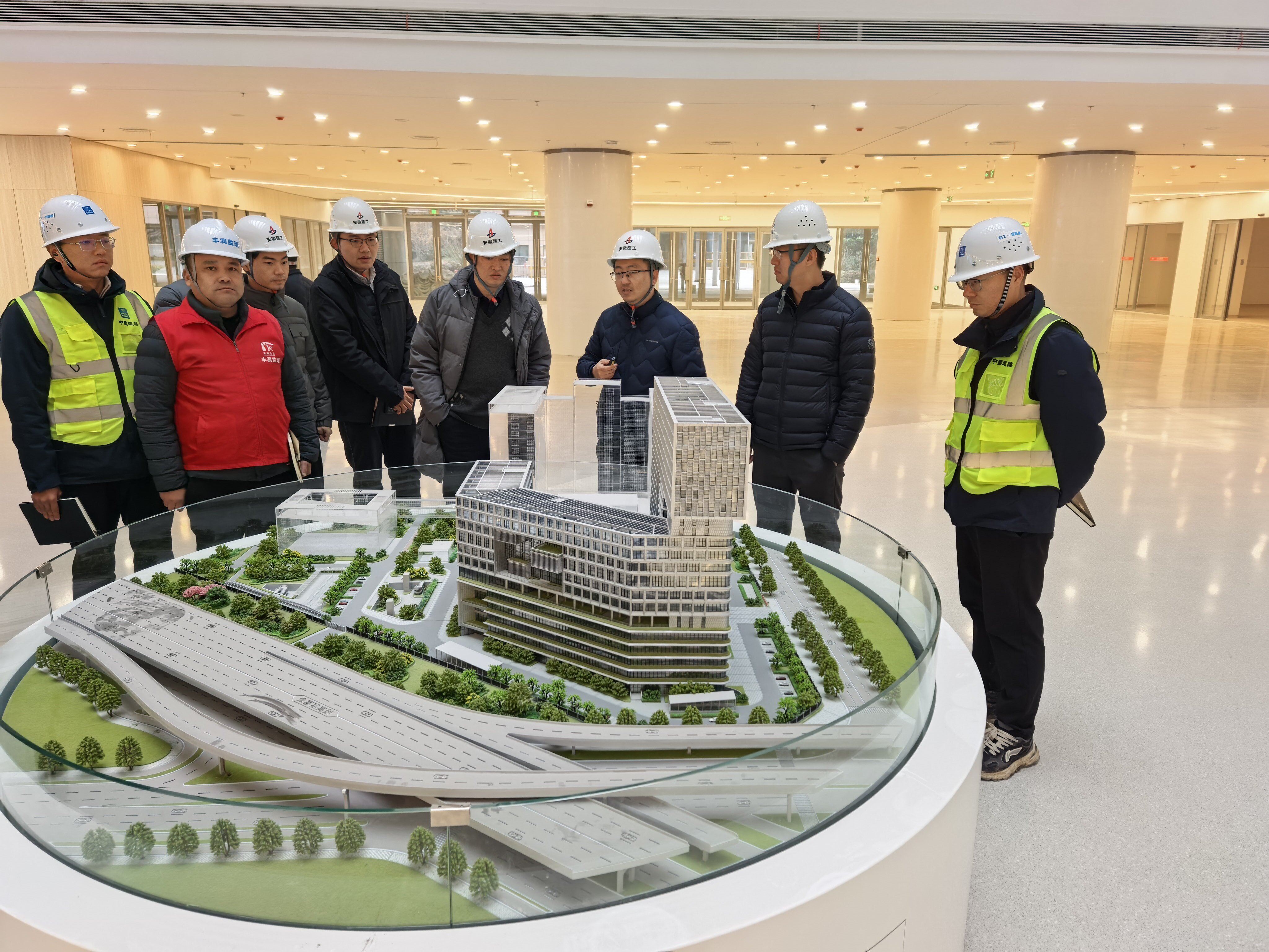 觀摩現場,在項目負責人與專業講解員的全程引導下,全體人員依次實地參觀項目大堂、標準層病床空間、精裝修樣板間、報告廳及幕墻樣板展示區等核心區域,近距離感受精品工程建設成果。